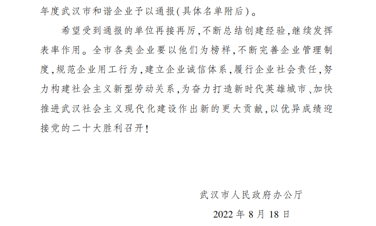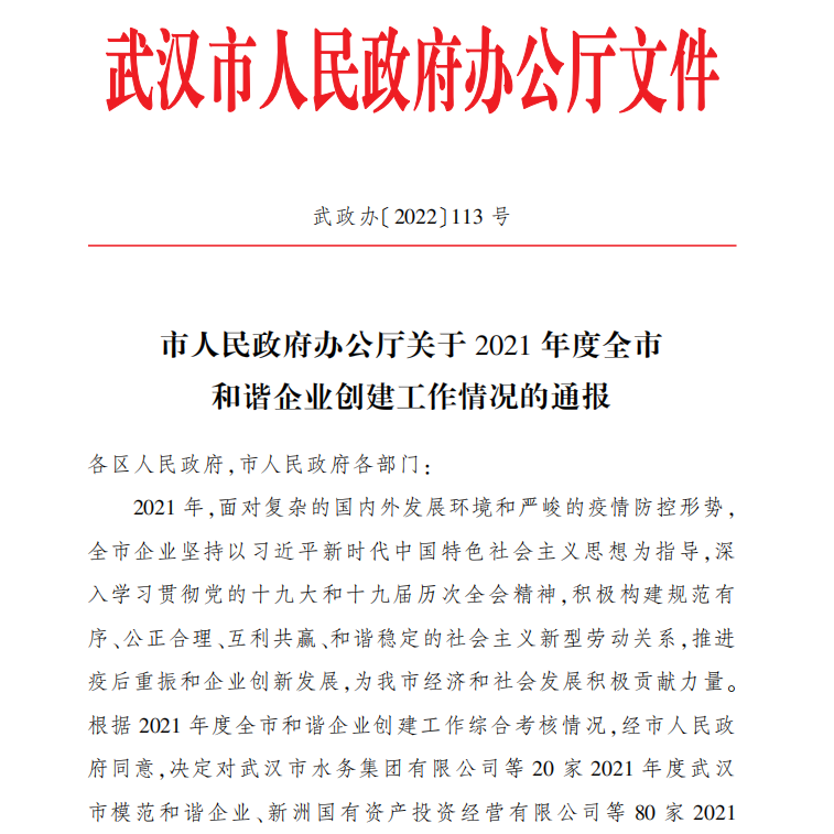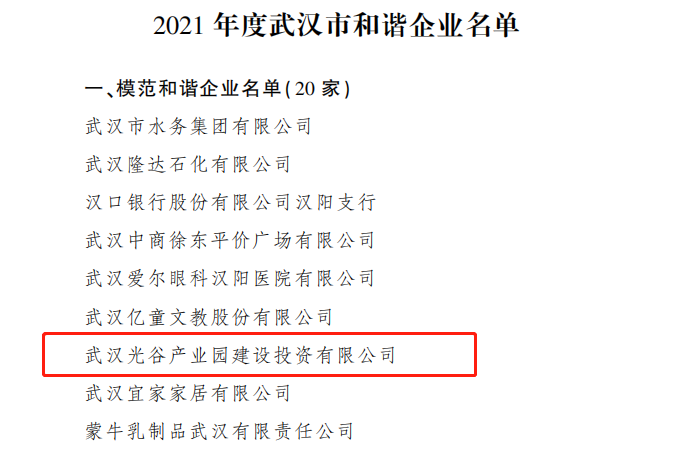 近日,武漢市人民政府辦公廳發(fā)布了《2021年度全市和諧企業(yè)創(chuàng)建工作情況的通報(bào)》,武漢光谷產(chǎn)業(yè)園建設(shè)投資有限公司繼榮獲武漢市和諧企業(yè)、職工心靈加油站稱號(hào)后,獲評(píng)“2021年度武漢市模范和諧企業(yè)”榮譽(yù)稱號(hào)。