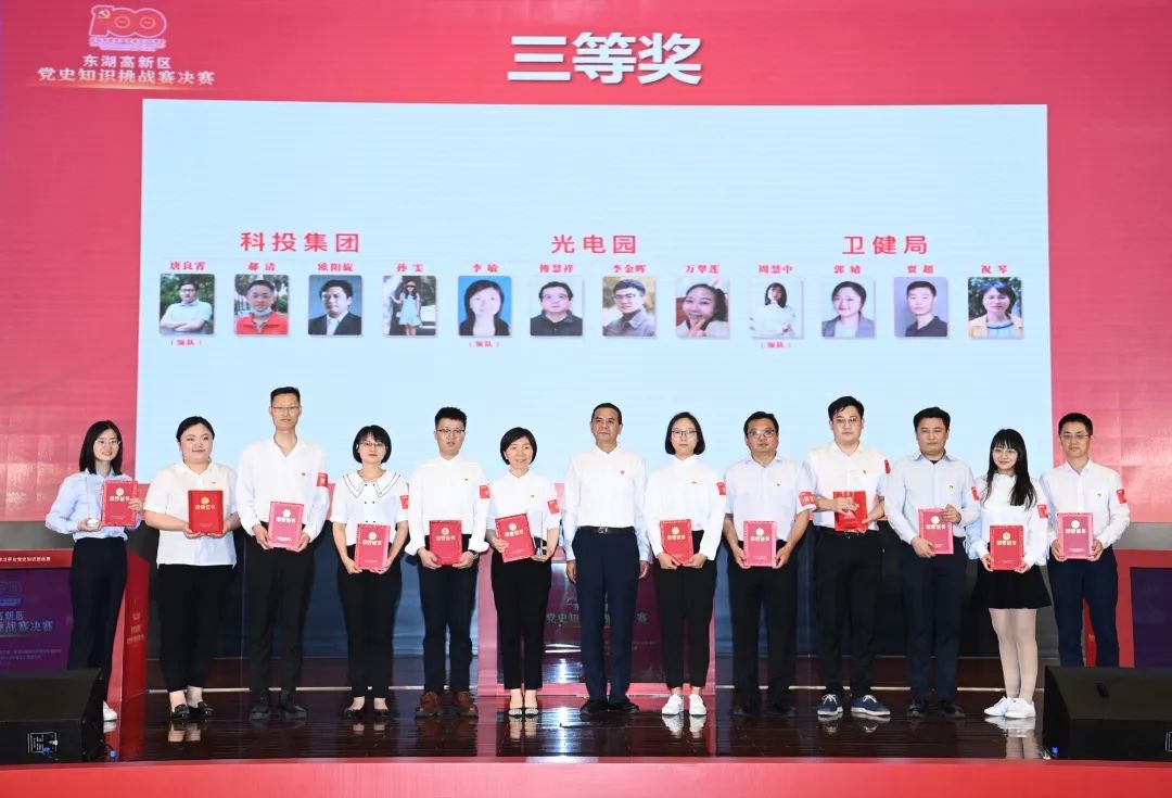 5月21日下午,東湖高新區(qū)黨史知識競賽挑戰(zhàn)賽決賽舉行,市紀(jì)委監(jiān)委派出東湖高新區(qū)紀(jì)檢監(jiān)察工委書記李軍,市委宣傳部副部長、市黨史學(xué)習(xí)教育辦公室宣講工作組組長吳天勇,東湖高新區(qū)管委會副主任宋治平、張傳遠(yuǎn),東湖高新區(qū)管委會總經(jīng)濟(jì)師李首文,東湖高新區(qū)黨工委政法委副書記曾祥華,市工科院黨委書記、院長程百煉出席活動。